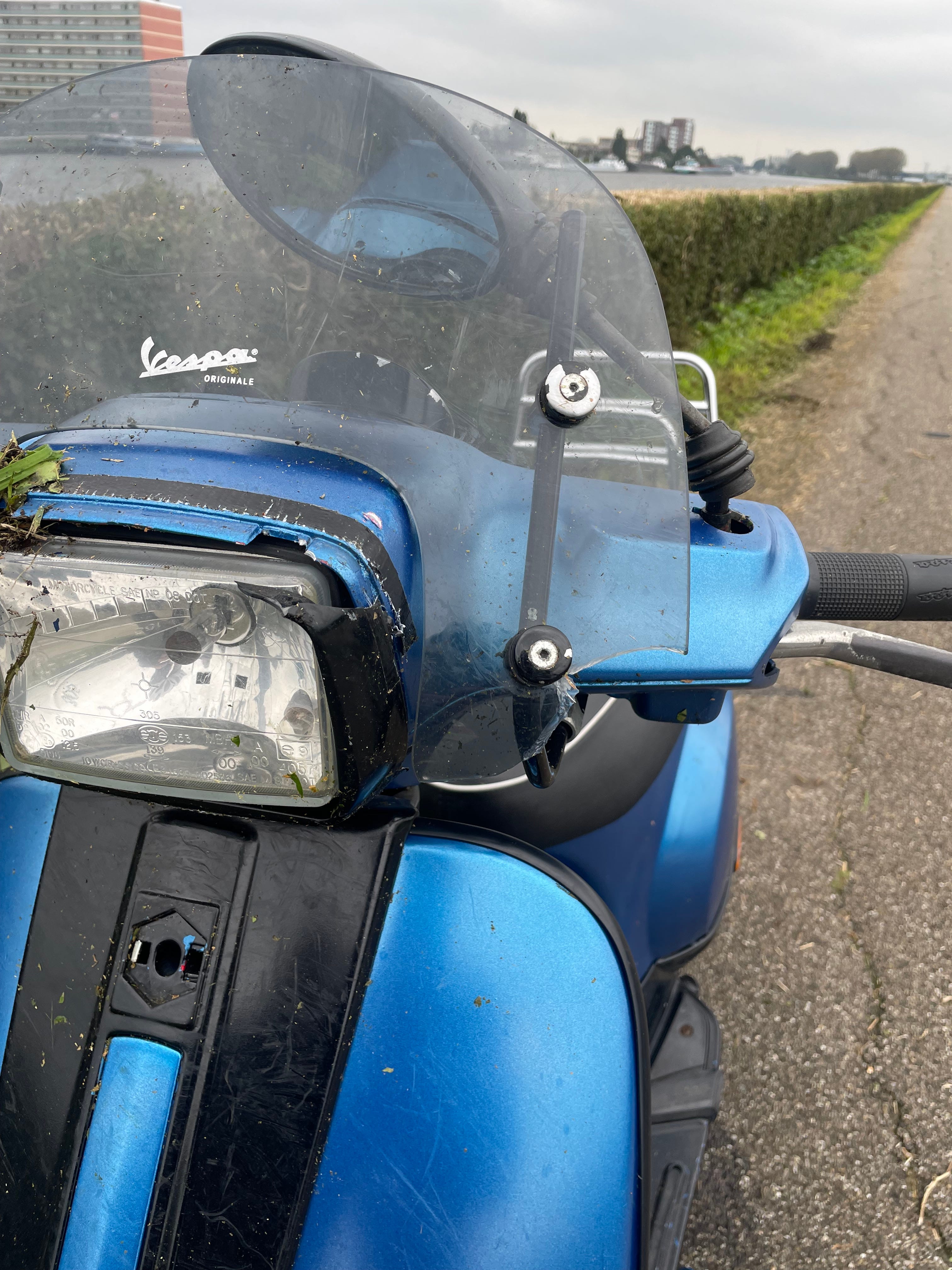 Hij raapt zijn scooter op, een blauwe Vespa, en probeert hem te starten. De motor weigert. Het ruikt naar benzine. De voorkant is flink beschadigd.