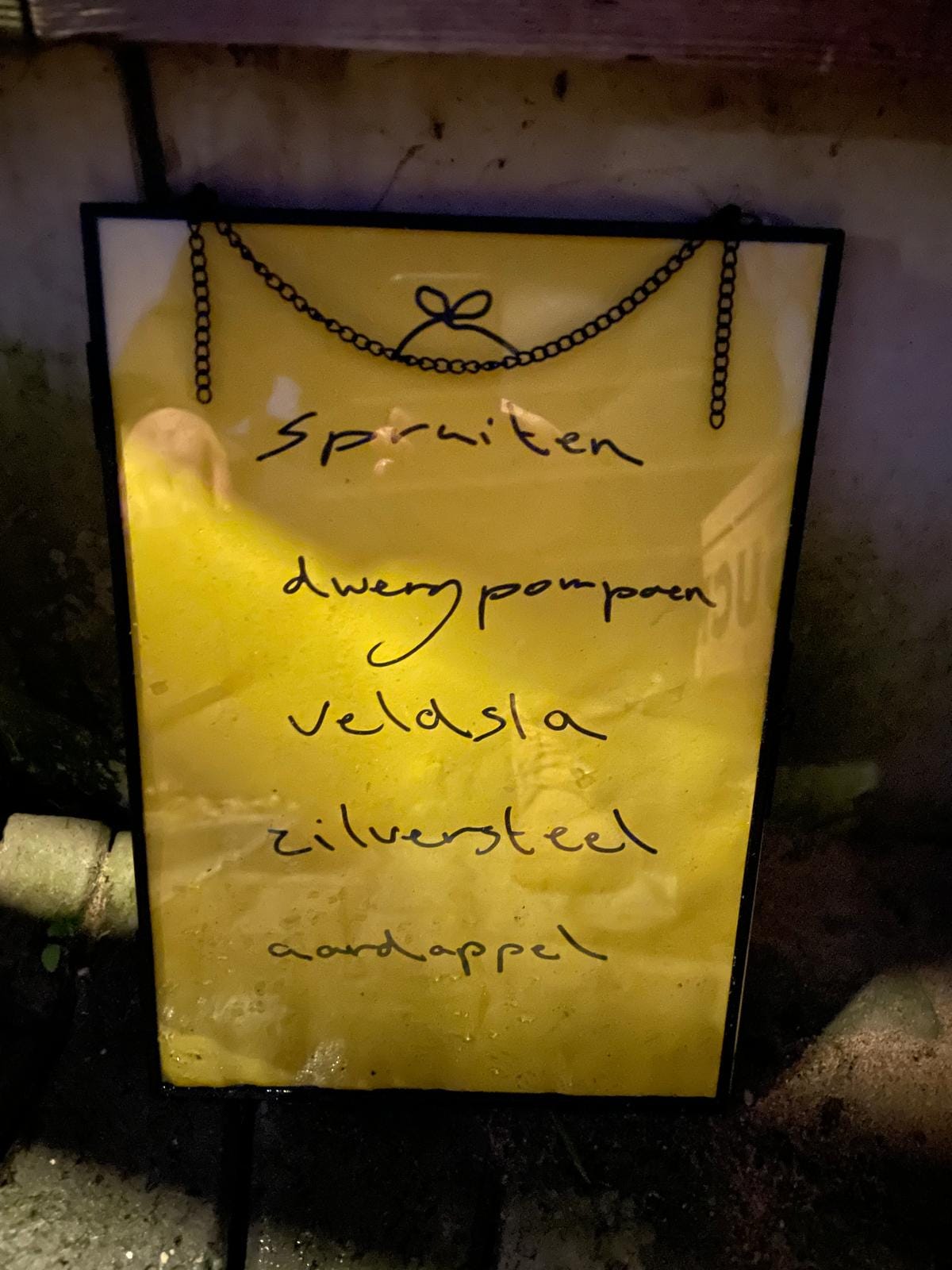 Ik spring over een sloot en baan me weg door het gras. Ik kom uit bij een huis waar inderdaad de kistjes klaarstaan, opgestapeld, het loof eruit hangend. Een ingelijst papiertje vertelt wat erin zit: spruiten, dwergpompoen, veldsla, zilversteel, aardappel.