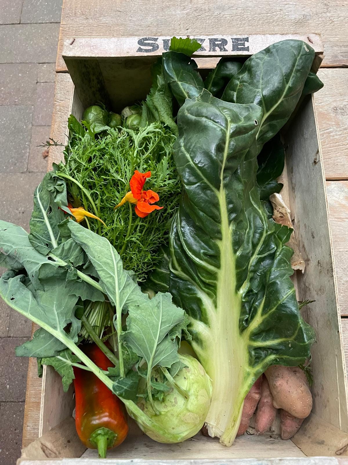 Bij ons kistje ligt ook nog een kookboek en een briefje: ‘Geniet van jullie eerste groentekistje! In het boek vind je suggesties voor lekkere gerechten die je ermee kunt maken. Groetjes.’